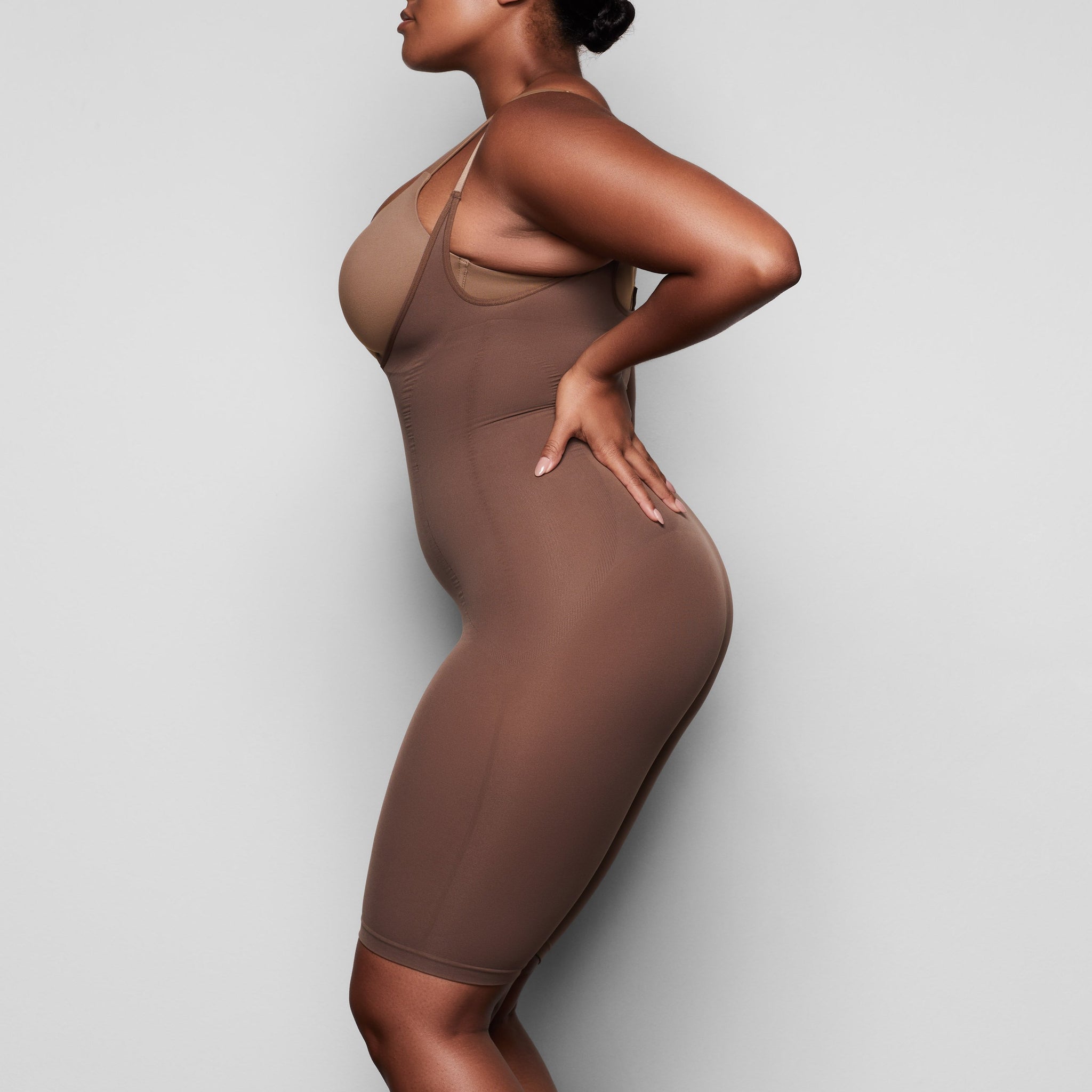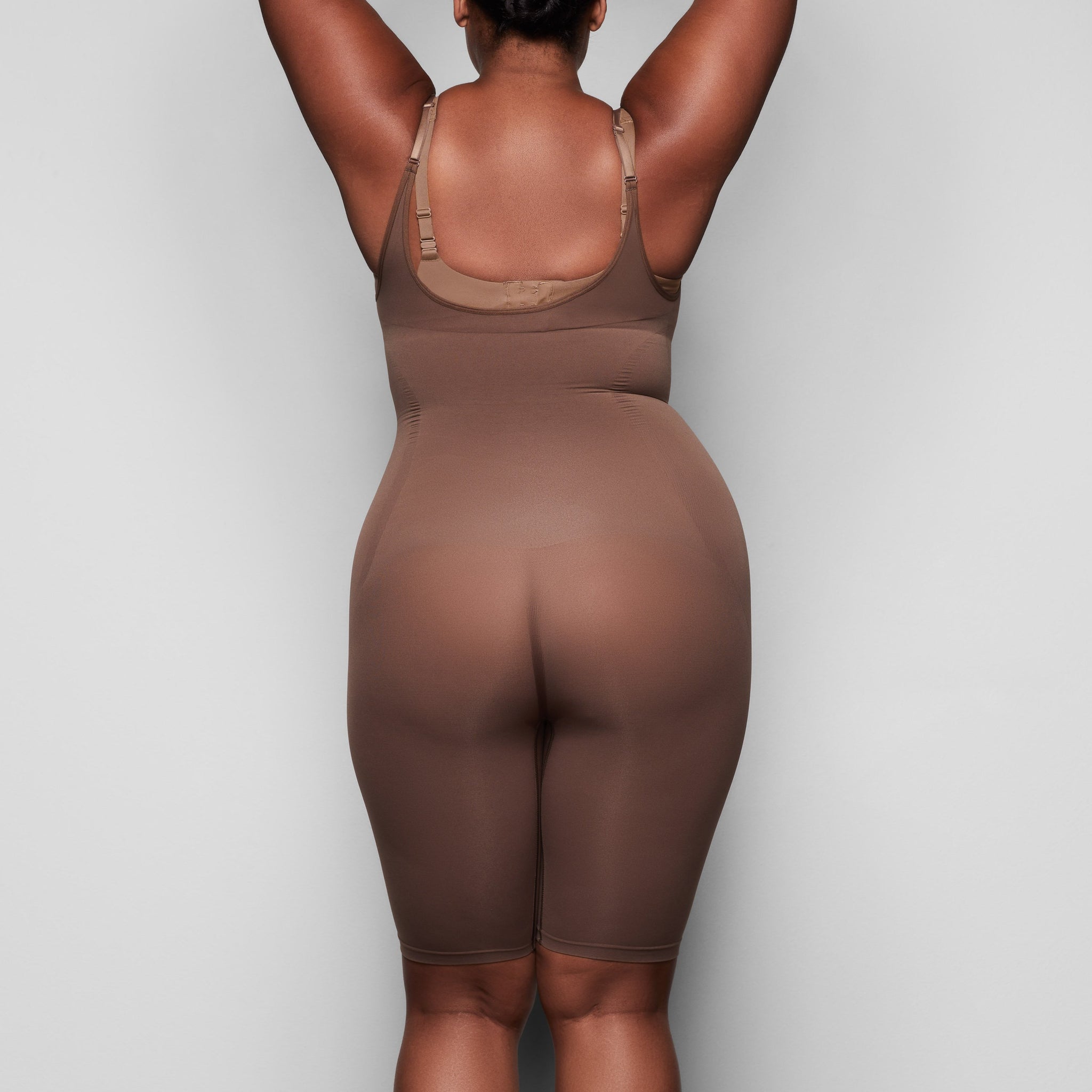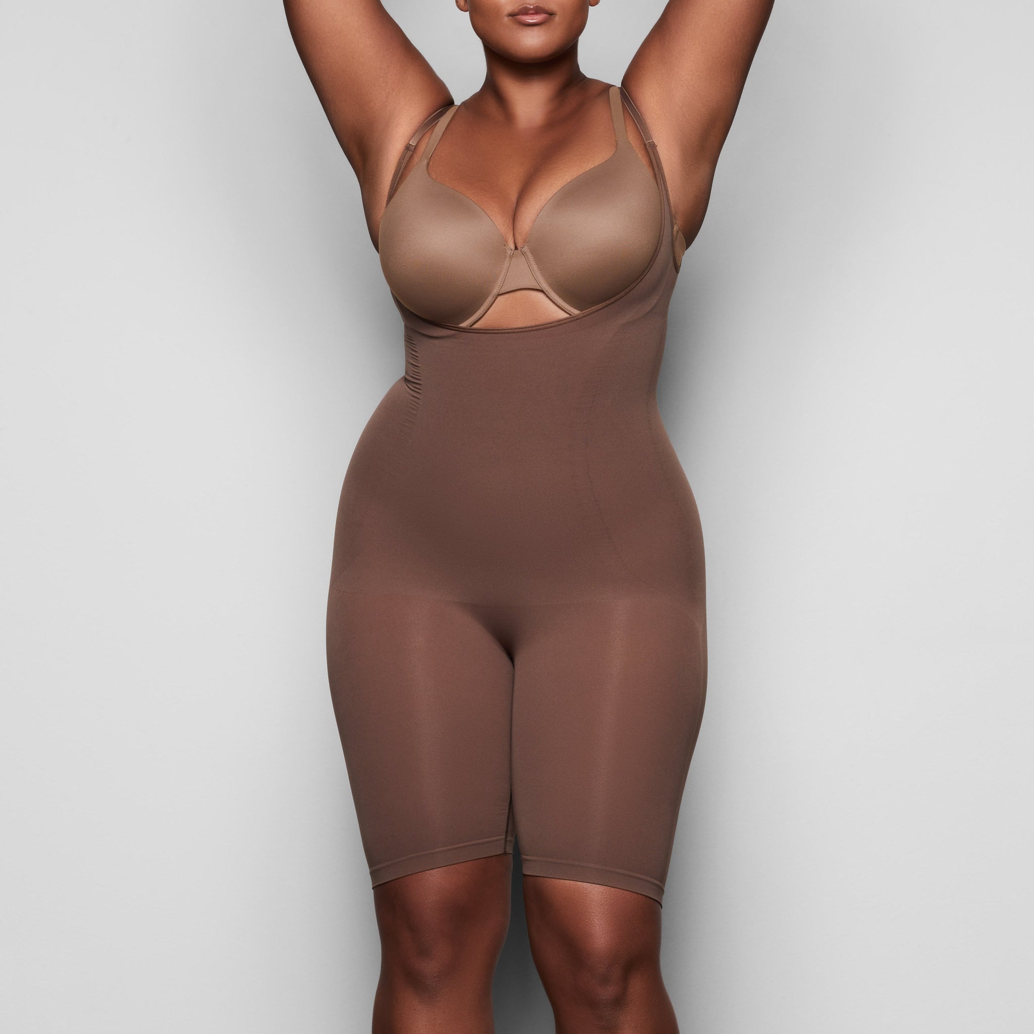With a mid-thigh length, this bodysuit holds in your core, shapes and lifts your butt and chest, and smooths your upper thighs. Its open bust feature allows you to wear your own bra underneath, and whisper-soft and seamless construction makes this sculpting piece a necessity for enhancing your body’s natural shape.